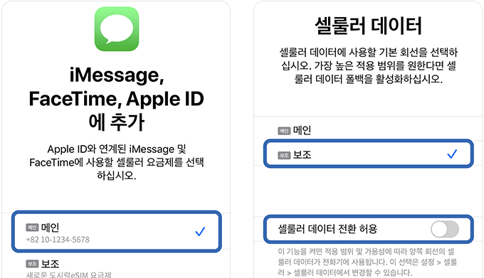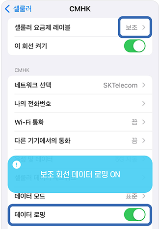 - 셀룰러데이터를'메인'으로 선택한 상태에서 데이터 로밍을 켜면 국내 통신사(메인 회선)로부터 로밍비용이 부과될 수 있습니다.