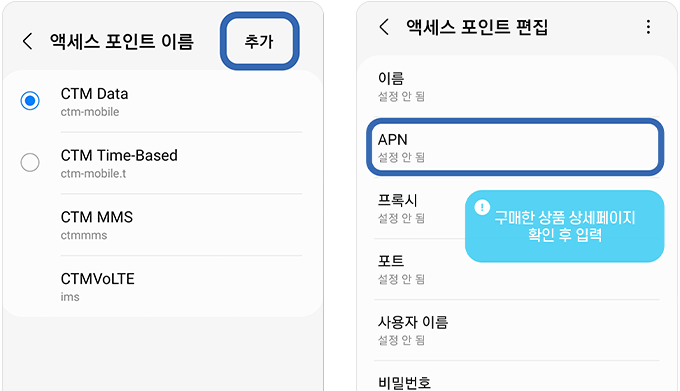 [설정] -> [연결] -> [모바일 네트워크] -> [액세스 포인트 이름] -> [추가]