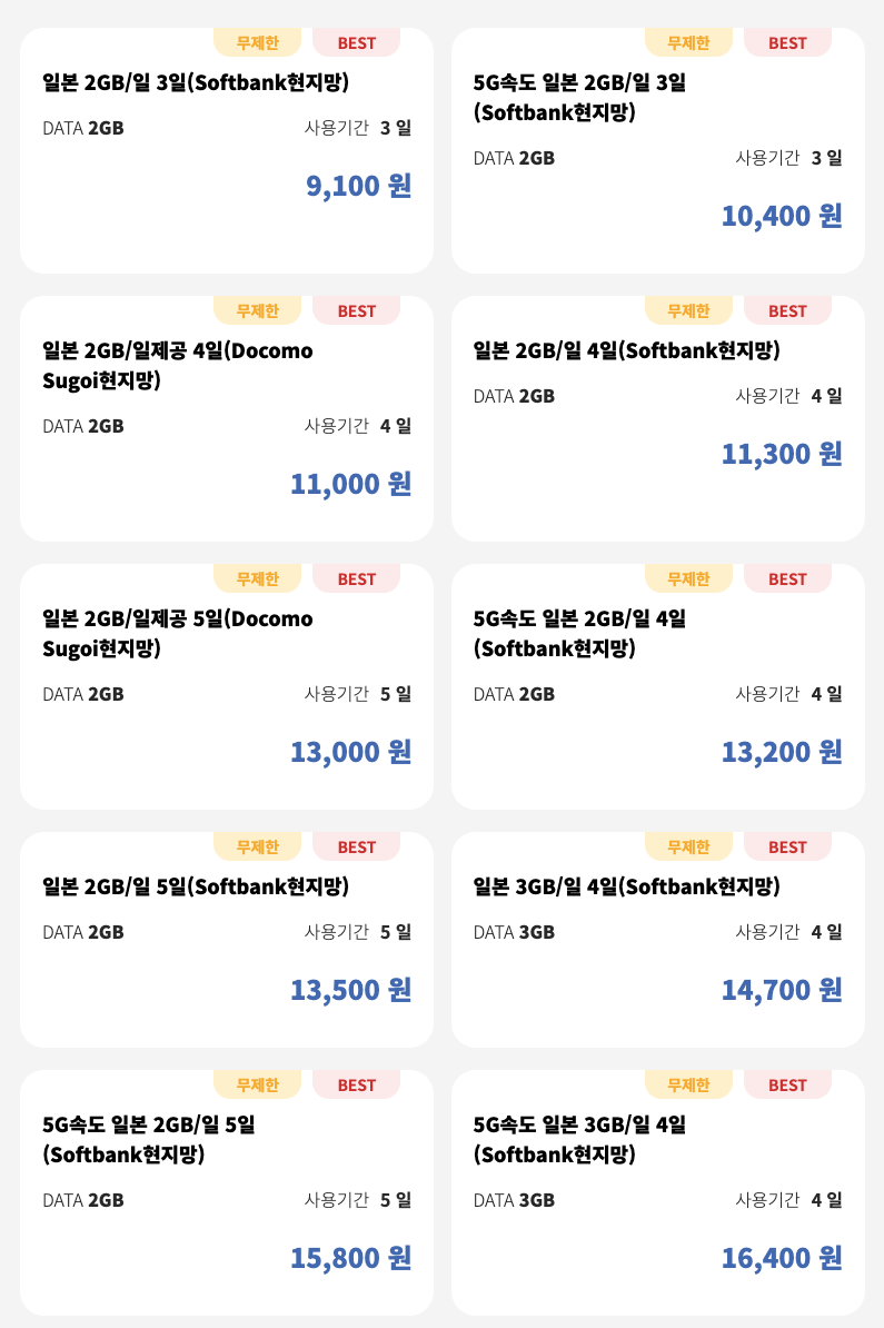 이심 홈페이지에서는 인기 국가인 일본, 대만, 베트남, 싱가포르, 미국 등 국가별 사용기간 및 데이터 용량에 따라 여러 개의 상품을 판매하고 있습니다.