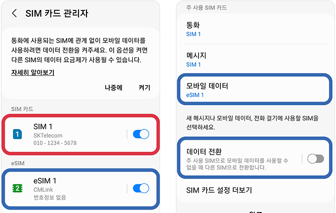 3. 설치(개통) 후 eSIM 사용을 위해 아래와 같이 설정 변경