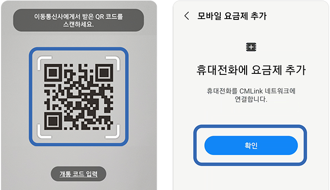 문자와 이메일로 받은 QR코드 이미지를 스캔하고 휴대전화에 요금제 추가 화면이 뜨면 [확인] 버튼을 선택하세요 (약 1분 소요)