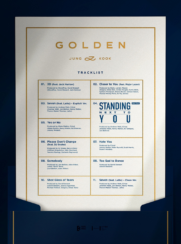 BTS 정국은 16일에 방탄소년단 공식 SNS를 통해 자신의 첫 번째 솔로 앨범 'GOLDEN'의 트랙리스트를 포스팅했습니다. 이 앨범은 세계적인 뮤지션들과 함께 완성된 그의 첫 솔로 앨범입니다.